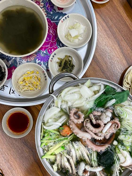 낙지도 맛있지만 칼국수도 맛있어요 새우, 황태, 바지락 들어가 있고 바지락 양이 엄청 많아요! 칼국수는 주문하면 조리시간이 10분 이상 걸려요 셀프바에 밥도 먹을 수 있으니 칼국수 먹고 아쉬우면 밥까지!!