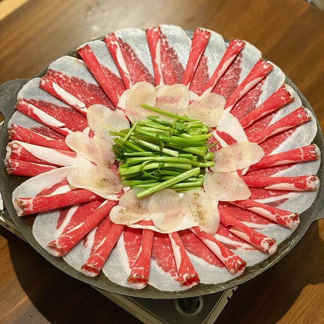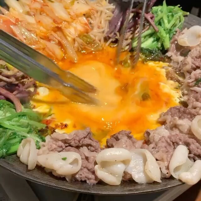 솥 위에서 펼쳐지는 불쇼로 SNS 인증샷은 필수! 차돌 각종 채소 등을 알맞게 구운 후