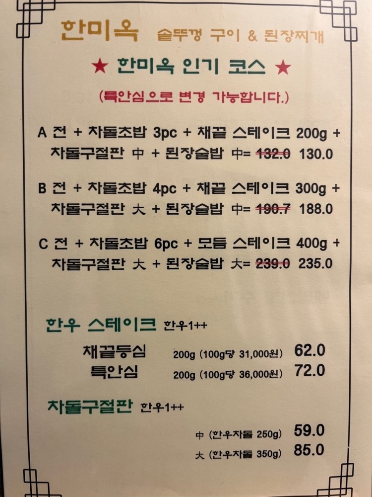 메뉴는 차돌구절판 한우 스테이크 A코스 된장술밥 솥뚜껑된장찌개 등 있네요.방문자 리뷰를 보면